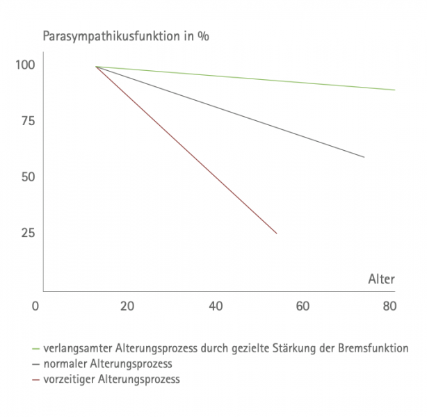 Die Leistungsfähigkeit unserer „inneren Bremse“ lässt mit zunehmendem Alter nach. Ungesunde Lebensweise und schädigende äußere Einflüsse führen zur vorzeitigen Alterung. Eine gezielte Stärkung des Parasympathikus kann diesen Prozess verlangsamen und sogar umkehren. Eine Verbesserung der Regelfunktion ist fast immer möglich und sollte auf jeden Fall angestrebt werden.
